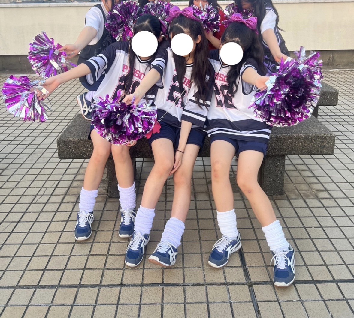 チア風コーデが可愛い💖ホットピンクカラーの前面プリントで、ブラックグレーユニでも明るい印象に✨