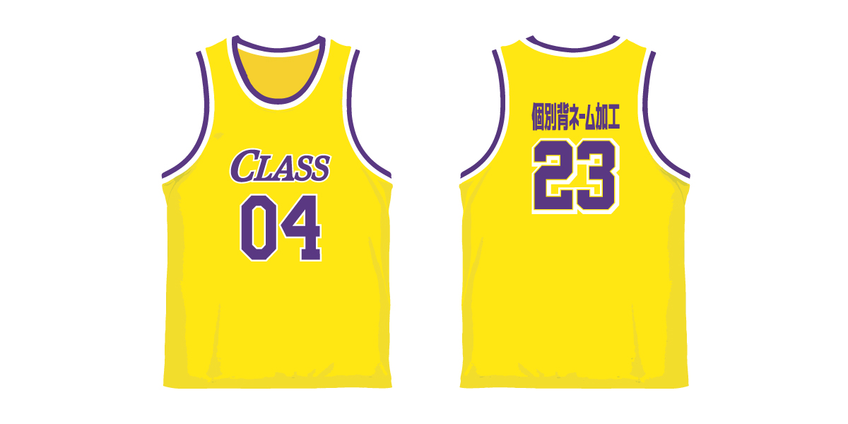 レイカ―ス風な黄色パープルが映えるクラスTバスケユニフォーム